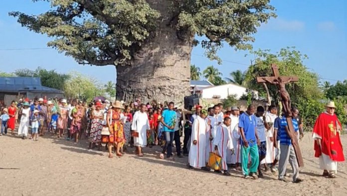 una piccola comunità cristiana che si ferma vicino al baobab, questa pianta multisecolare che